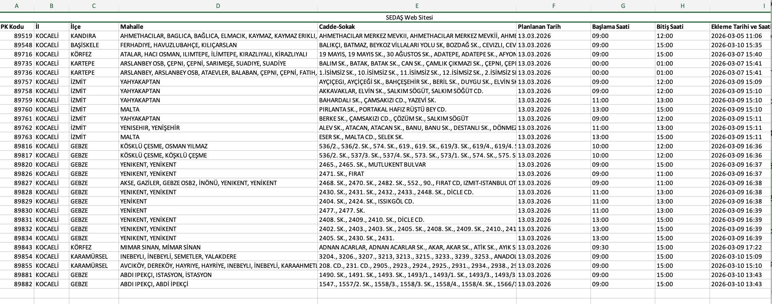 Sakarya Elektrik Dağıtım A.Ş. (SEDAŞ) tarafından yayımlanan planlı kesinti programına göre Kocaeli’nin Kandıra, Başiskele, Körfez, Kartepe, İzmit, Gebze ve Karamürsel ilçelerinde geniş çaplı elektrik kesintileri yapılacak. Kesintilerin nedeni olarak şebeke bakım çalışmaları, hat yenileme işlemleri ve enerji altyapısının güçlendirilmesi gösterildi. Yetkililer, çalışmaların tamamlanmasının ardından enerjinin kademeli olarak yeniden verileceğini belirtti.